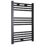 Fabricado en Acero. Acabado en NEGRO. Radiador secatoallas ELÉCTRICO. Incluye tapones y soportes. Termostato regulable en temperatura y tiempo hasta 5h. 600W Consulte con un instalador profesional para su instalación. Disponible también en 40cm de ancho.